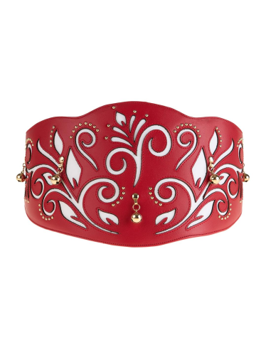 Cinturón de Zíngara de piel color rojo, con transparente en piel color blanco, herrajes dorados y cierre de hebilla dorada.