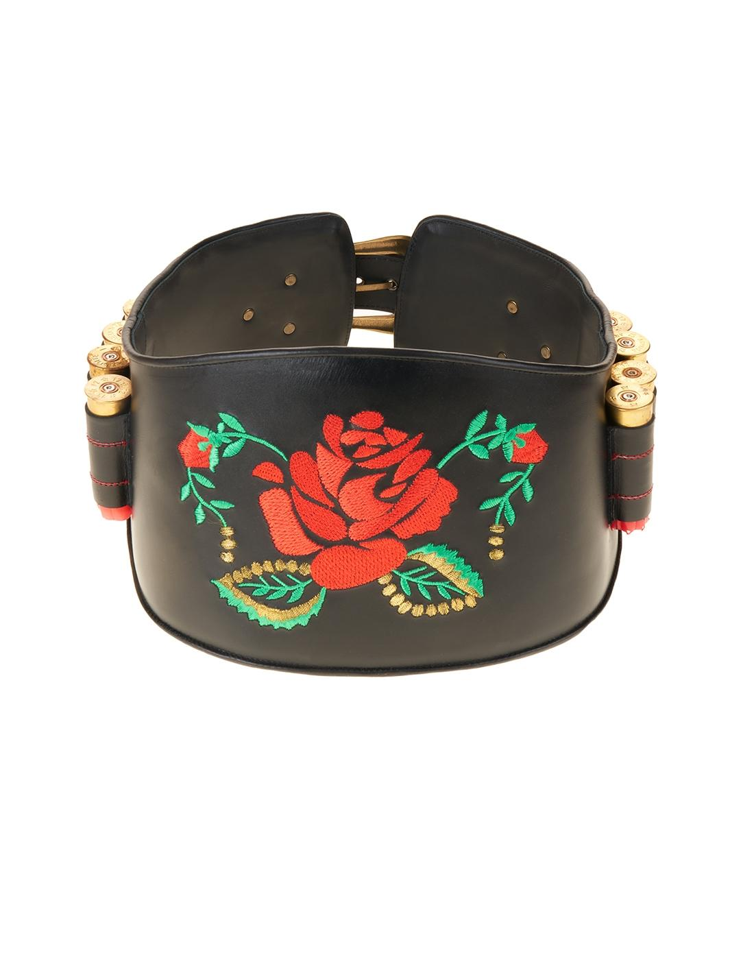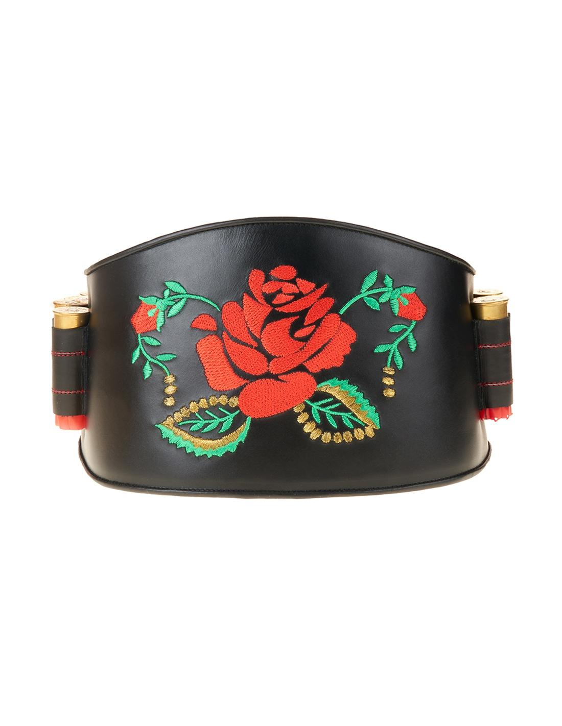 Canana de contrabandista de piel color negro, con ribete y adornos de piel color negro, bordado en tonos dorados, rojos y verde, y cierre de hebilla.