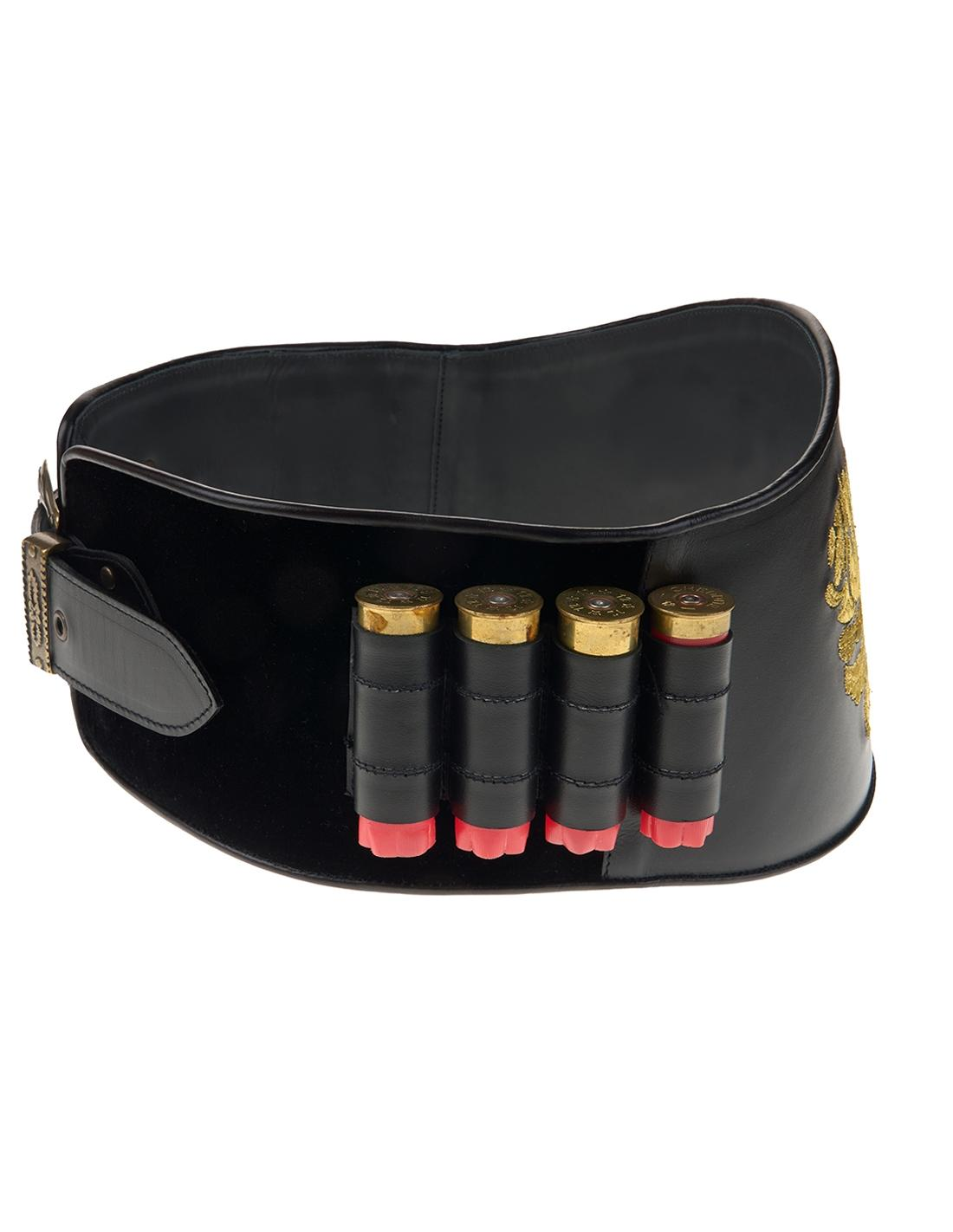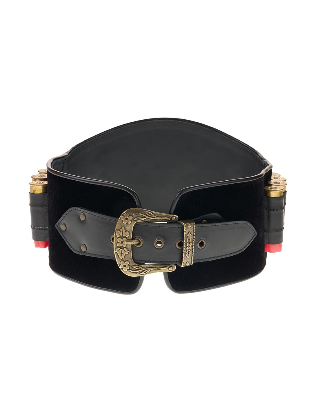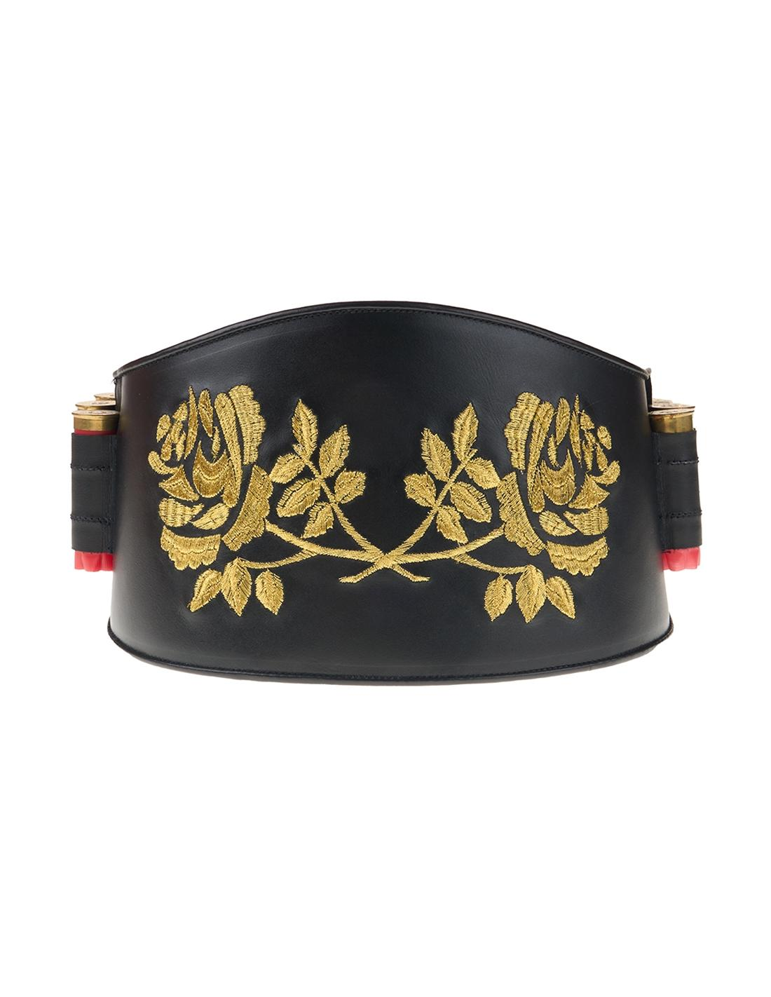 Canana de Contrabandista que combina piel color negro y terciopelo color negro, con ribete y adornos de piel color negro, bordado en tono dorado y cierre de hebilla.
