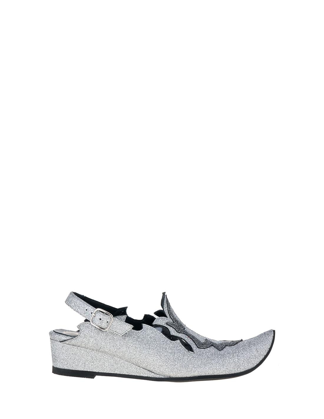 Zueco de piel acabada en glitter plata, con adorno de piel acabada en glitter color plata oscura.