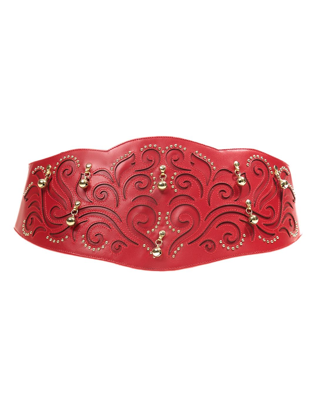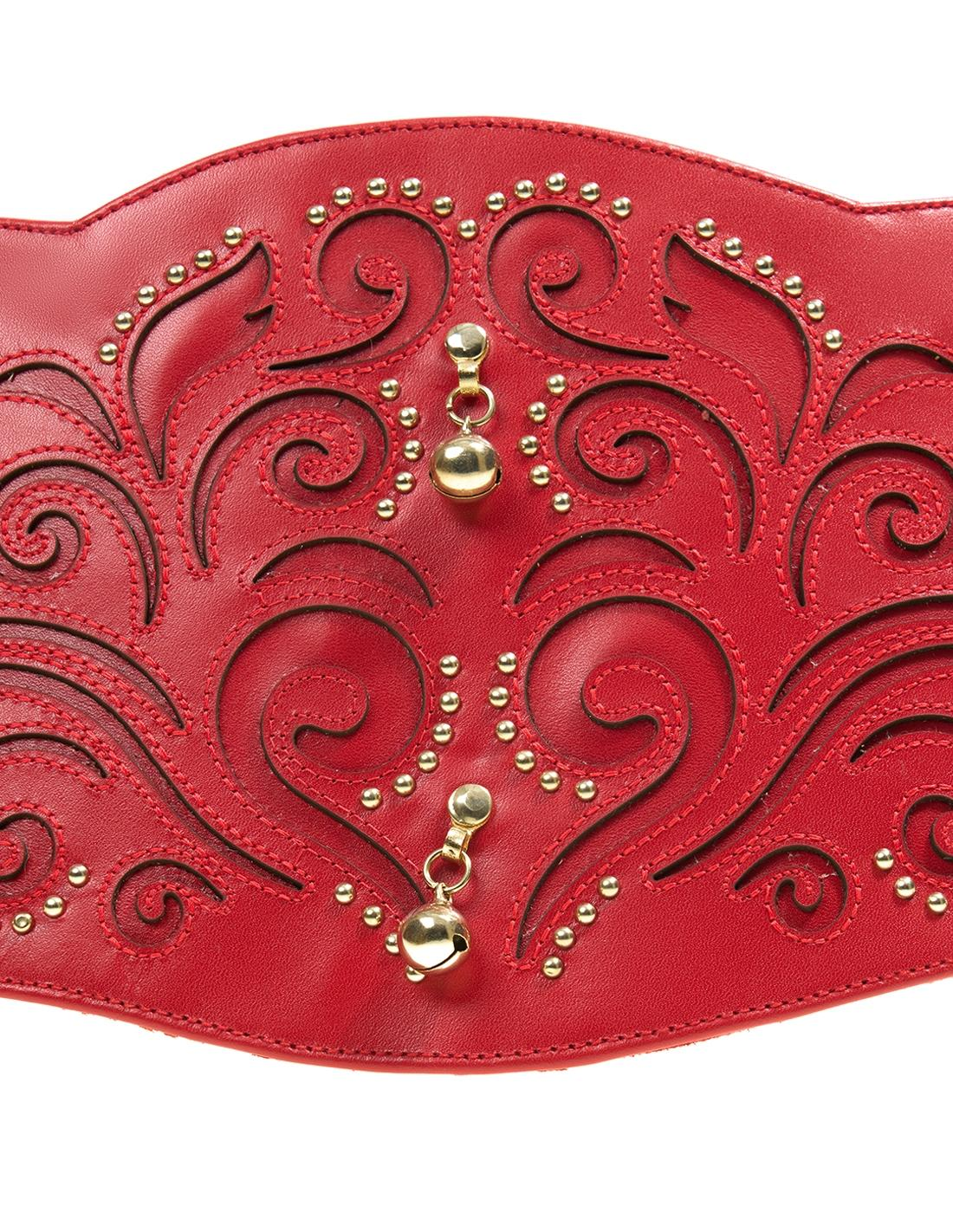 Cinturón de Zíngara de piel color rojo, con transparente en piel color rojo, herrajes dorados y cierre de cordones al tono.