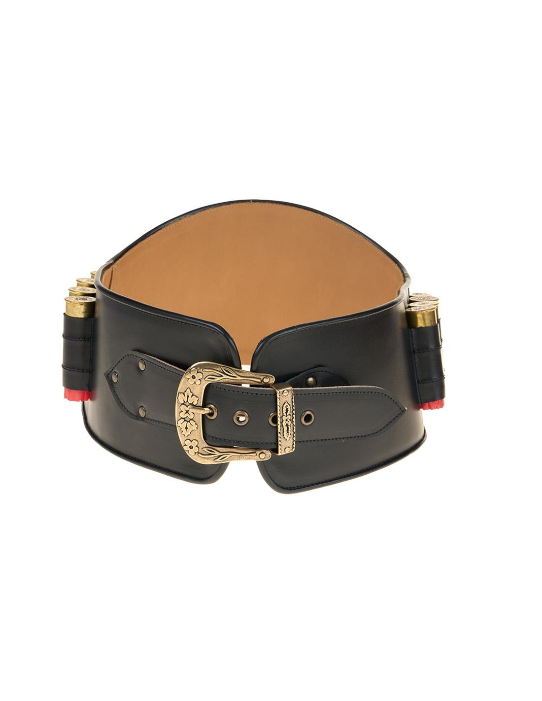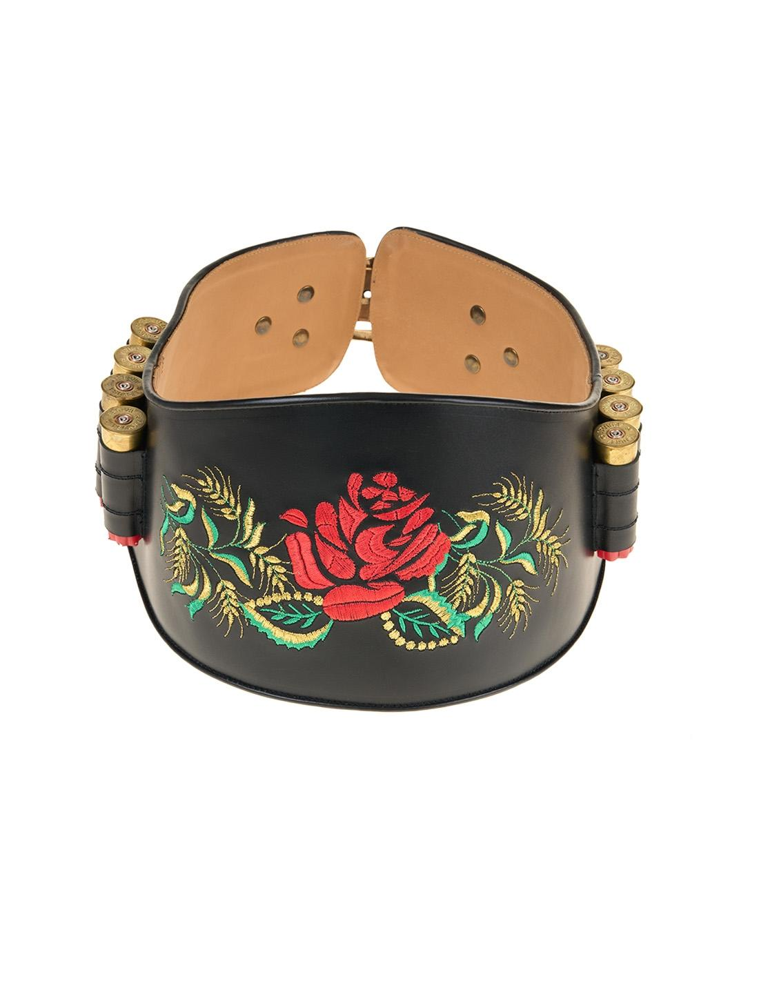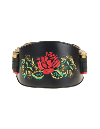 Canana de Contrabandista de piel color negro, con ribete y adornos de piel color negro, bordado en tonos rojo, verde y dorado, y cierre de hebilla.