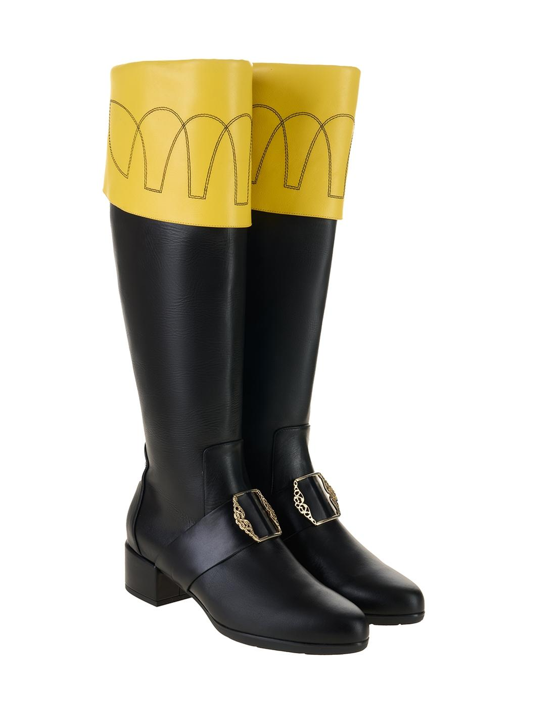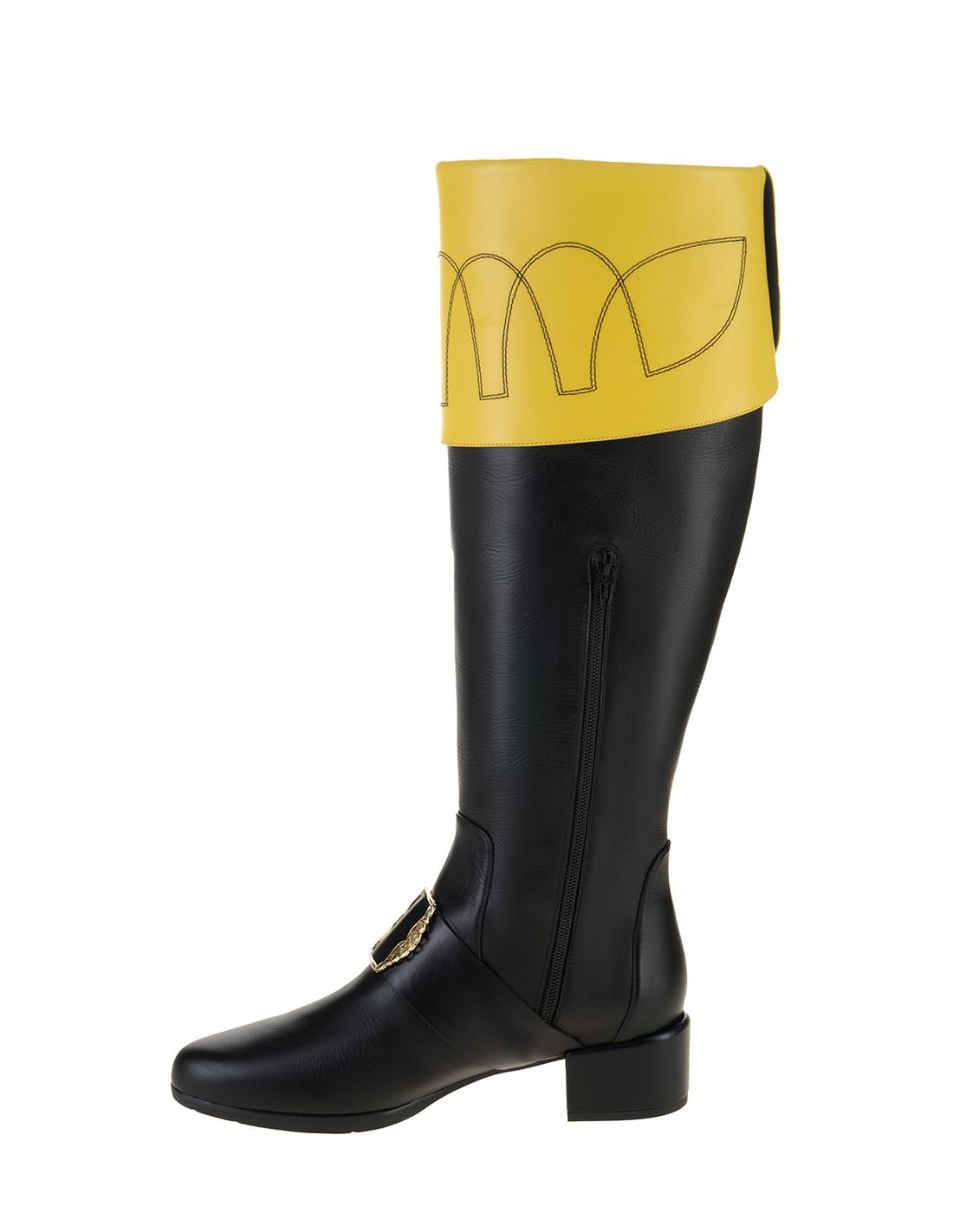 Bota negra con solapa color amarillo, pespunte en negro y hebilla dorada en la pala. Este artículo calza justo, por lo que recomendamos una talla más de la habitual.